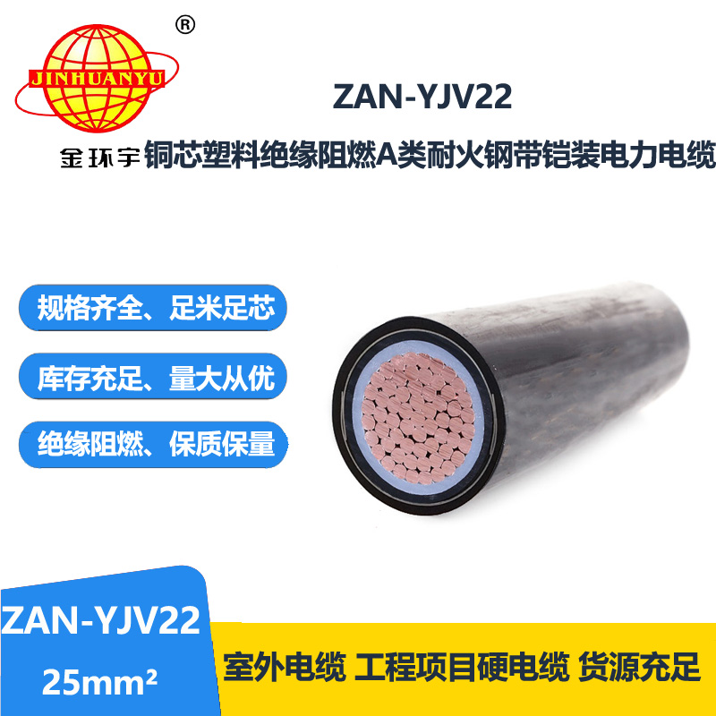 ZAN-YJV22电缆是阻燃a级耐火交联铜芯聚氯乙烯绝缘钢带铠装聚氯乙烯护套电力电缆。ZAN-YJV22 25平方是指电缆是1根铜芯为25平方毫米。